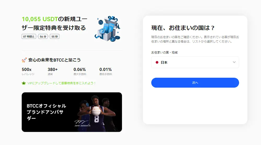 現在、BTCCでは新規口座開設と本人確認(KYC)の完了で、最大10,055 USDT相当のボーナス を獲得できます。